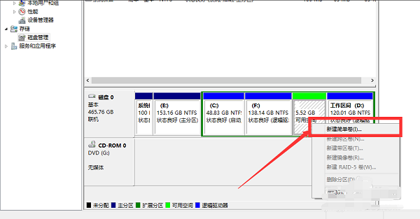 6、然后我们选中该空白分区,点击右键,选择“新建简单卷”。
