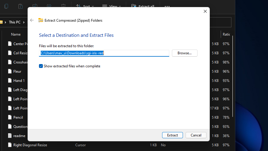 8、选择光标集的 ZIP 存档,然后单击文件资源管理器中的全部提取按钮。