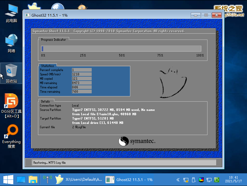 4、进入pe系统之后我们要对刚开始建立的磁盘进行分区,运行桌面的DG分布工具。(这里分区的是建立虚拟机时设置的磁盘,非加载U盘的磁盘)