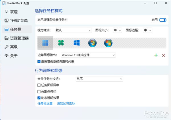 首先要出场的就是一个可以改进任务栏选项的Taskbar11,虽然它界面简单,但是可以实现的操作还真不少,使用它用户就可以将开始菜单和任务栏进行一番的打造。
