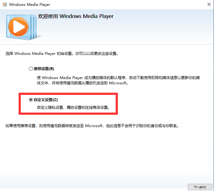 3、首次打开Windows Media Player需要进行初始设置,选择【推荐设置】或【自定义设置】,然后下一步。