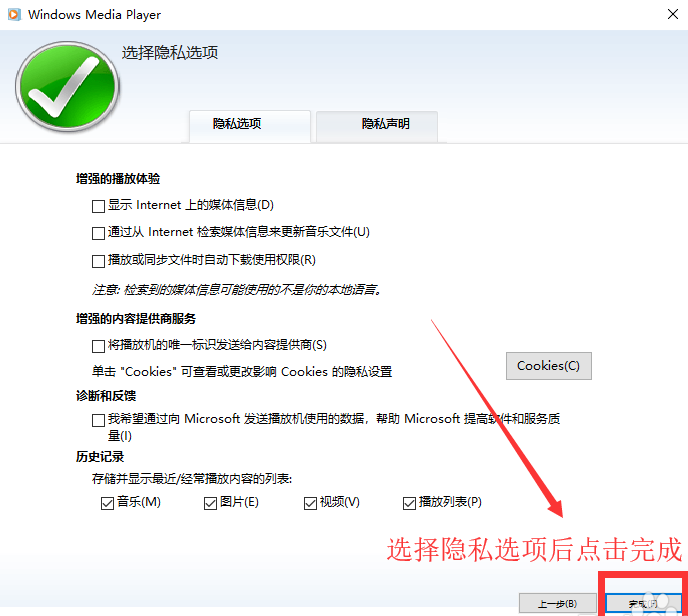 4、选择隐私选项后点击完成。