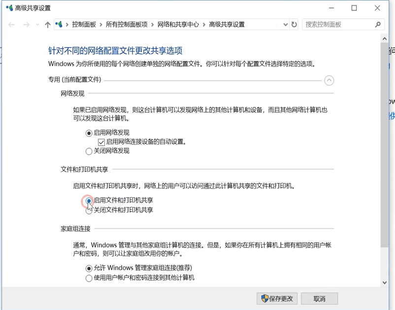 3.选择“启用网络发现”,启用”文件和打印机共享“。