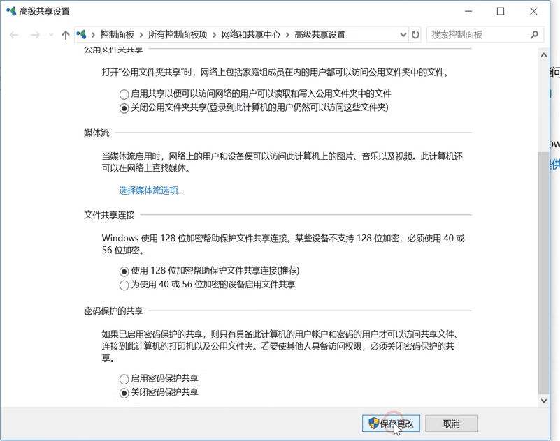 4.打开”所有网络“,勾选”关闭密码保护共享“,点击“保存更改”。