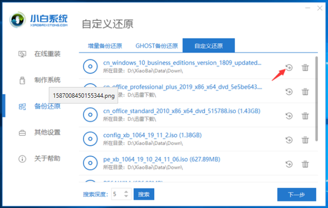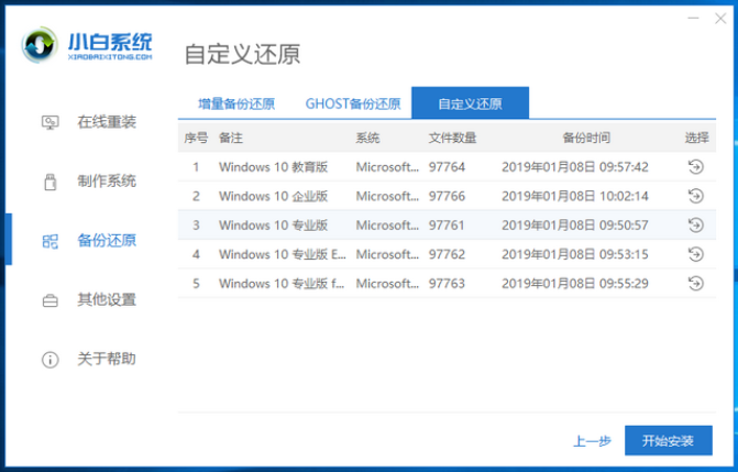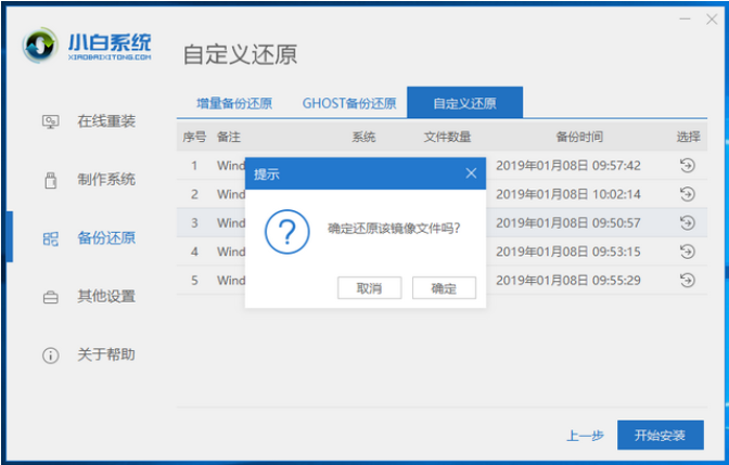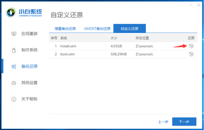 2、点击小白系统界面左侧的【备份还原】选项,然后切换成【自定义还原】,选择电脑上下载好的win10系统镜像,点击还原按钮。
