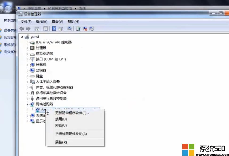 3.右键点击网卡设备选择更新驱动程序软件,选择自动搜索更新的驱动程序软件。