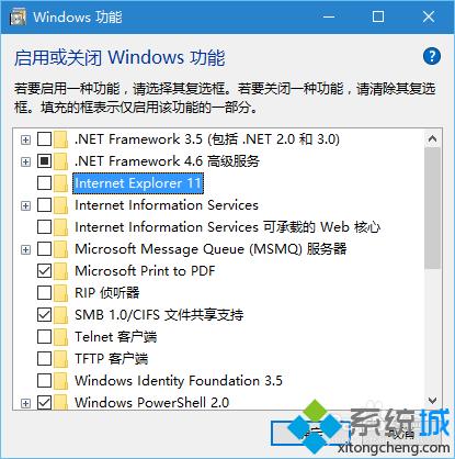 4、打开“Windows功能”面板。第一眼就能看到InternetExplorer11.也就是我们的IE;