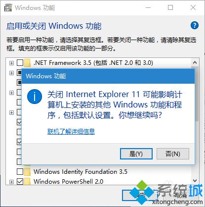 5、取消InternetExplorer11前面的对勾,会弹出一个警告框,点击“是”;