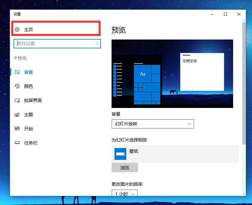 2、打开个性化后,选择右上角的【主页】,下图圈出的地方。