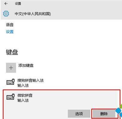 3、然后在下方找到“微软拼音”输入法,点击后,出现“删除”按钮,再点击即可删除;