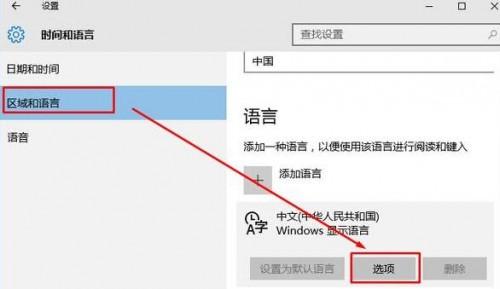 2、选择“区域和语言”,然后点击右侧的“中文”,再点击“选项”按钮;