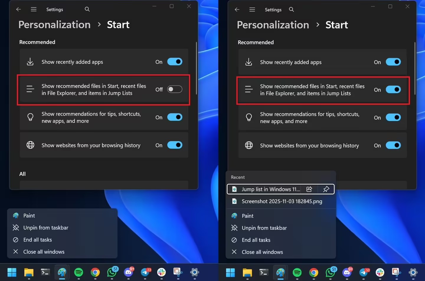 不过该媒体测试发现,这一改进带来了一个意想不到的副作用:当用户选择隐藏开始菜单的“推荐”项后,文件资源管理器中的“最近使用的文件”列表以及任务栏图标右键菜单中的“跳转列表”也会被一并禁用。
