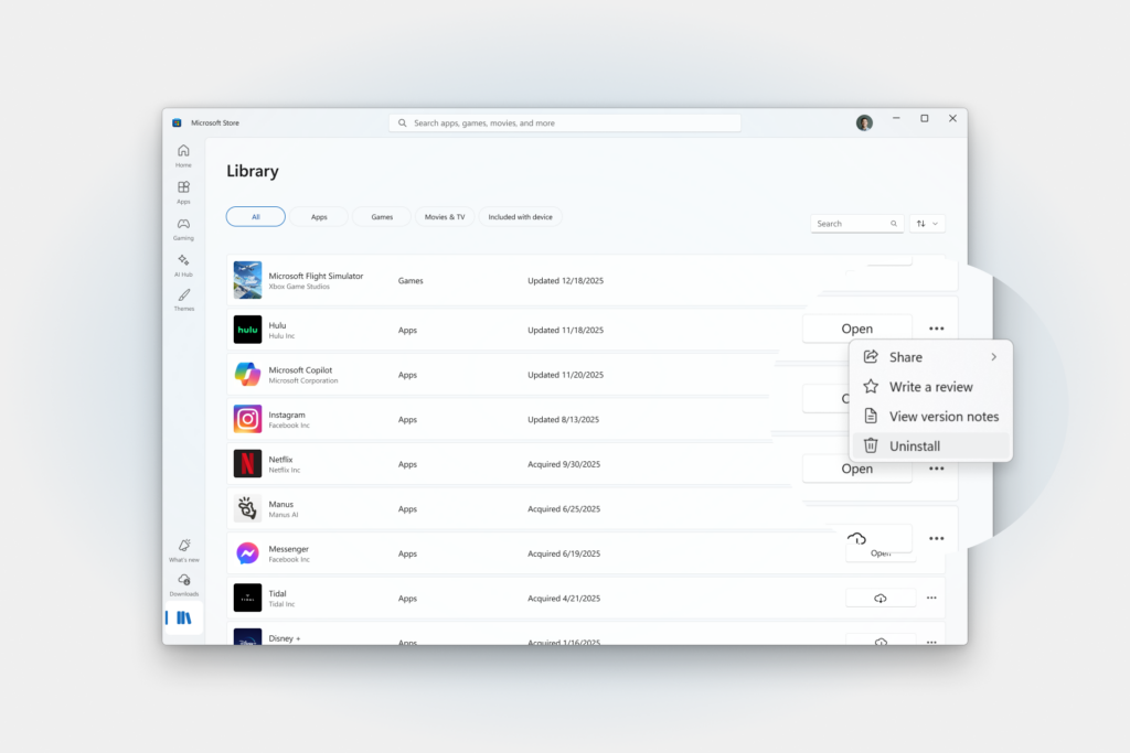 微软在 2025 年持续打磨商店的“基本功”。针对长期存在的痛点,新版商店终于支持在“库(Library)”中直接点击卸载应用,无需跳转设置菜单。