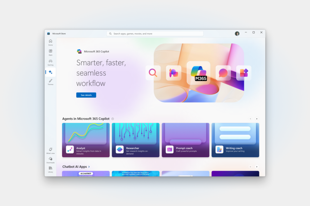 此外,商店进一步深化了 AI 布局:早在 2 月便重构了 AI Hub,并通过新增“AI 能力徽章”帮助用户快速识别支持 AI 的应用;在 Microsoft 365 中,用户现在还能直接搜索并获取各类 AI 智能体(Agents),涵盖写作指导、数据分析等场景。