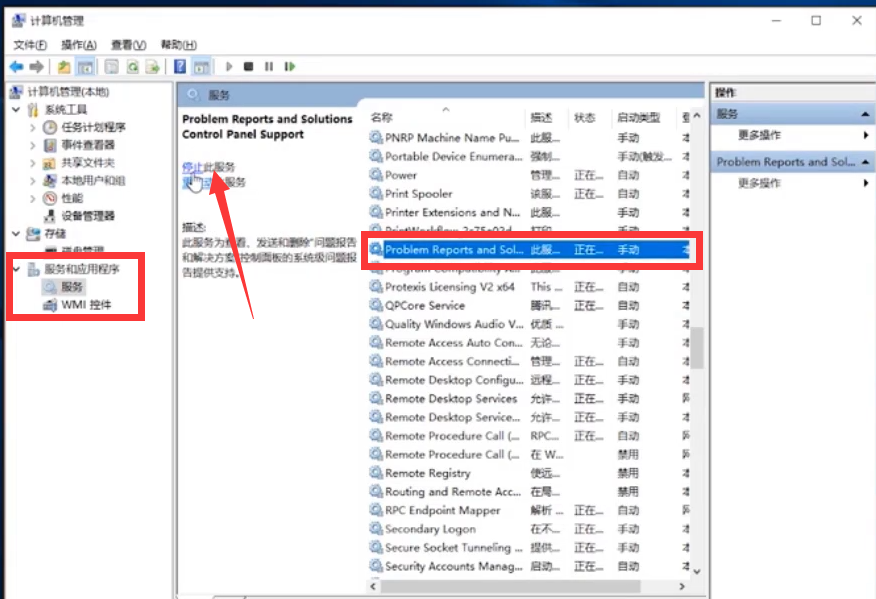 2、进入后在服务和应用程序--服务里找到图中红框中的程序,选中后点击“停止此服务”。