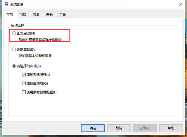 4、进入系统配置后外面点击正常启动。
