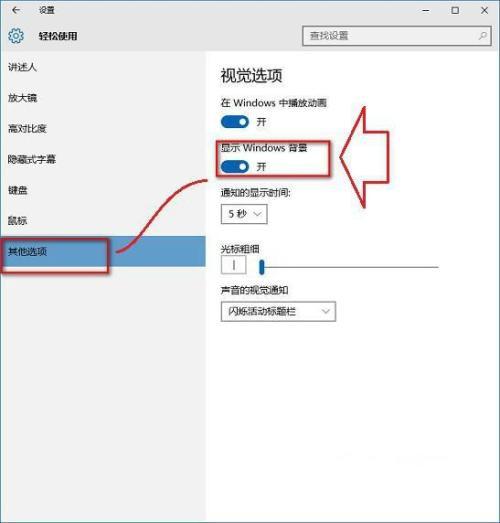 2、在轻松使用左侧菜单中选择“轻松选项”,并将显示windows背景开关设置为“开”状态即可;