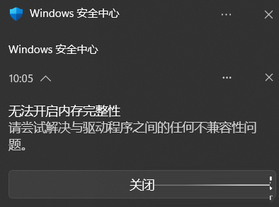 在设置界面大家可以看到一个运行内存完好性设置的开关,现在是关闭状态,我们试试点一下看看能不能开启,点一下后出现如下图所示提示信息,提醒运行内存完好性没法开启,主要原因是有驱动程序之间兼容问题。