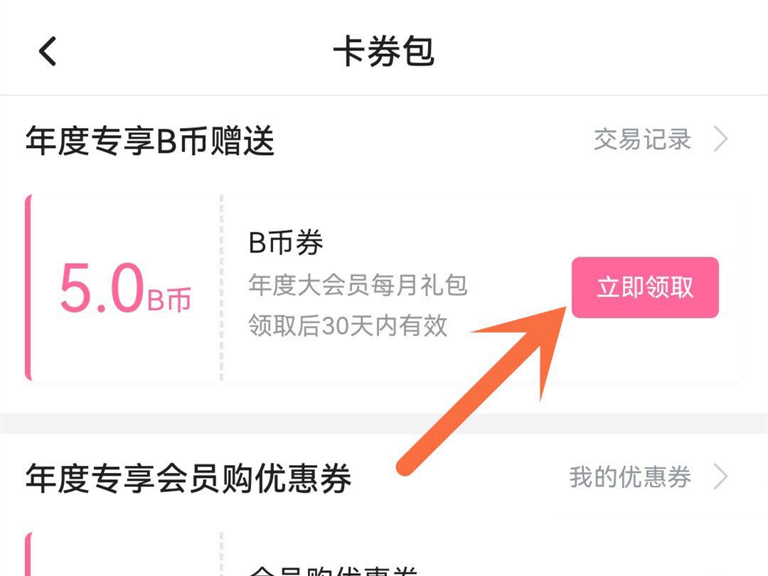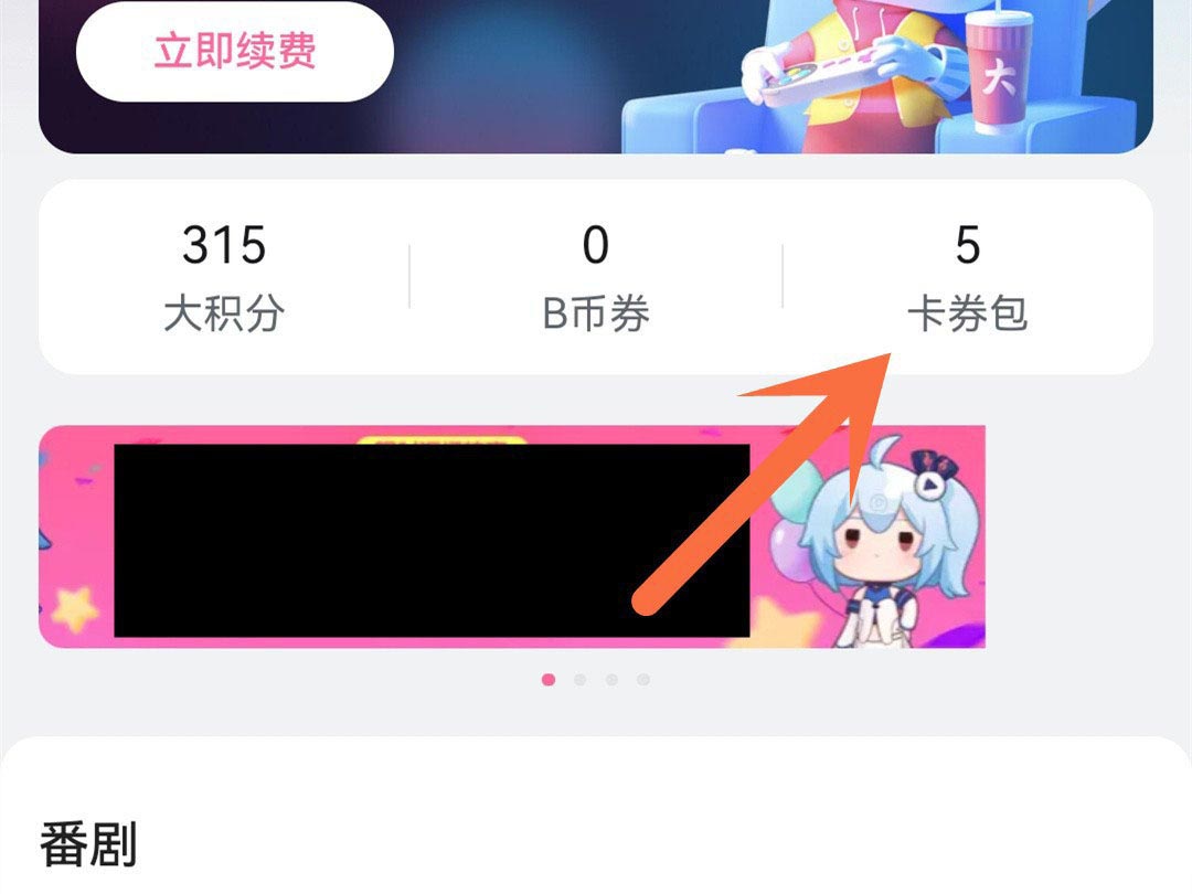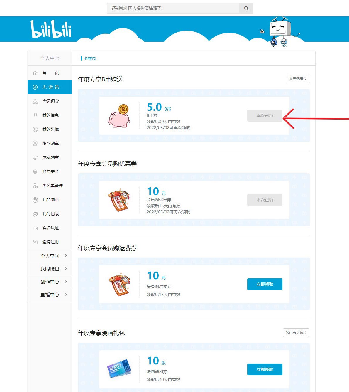 从菜单栏顶部的“大会员”菜单进入“大会员”页面,然后从在页面右侧的三个圆点图标下的“卡券包”进入领取B币券的界面。