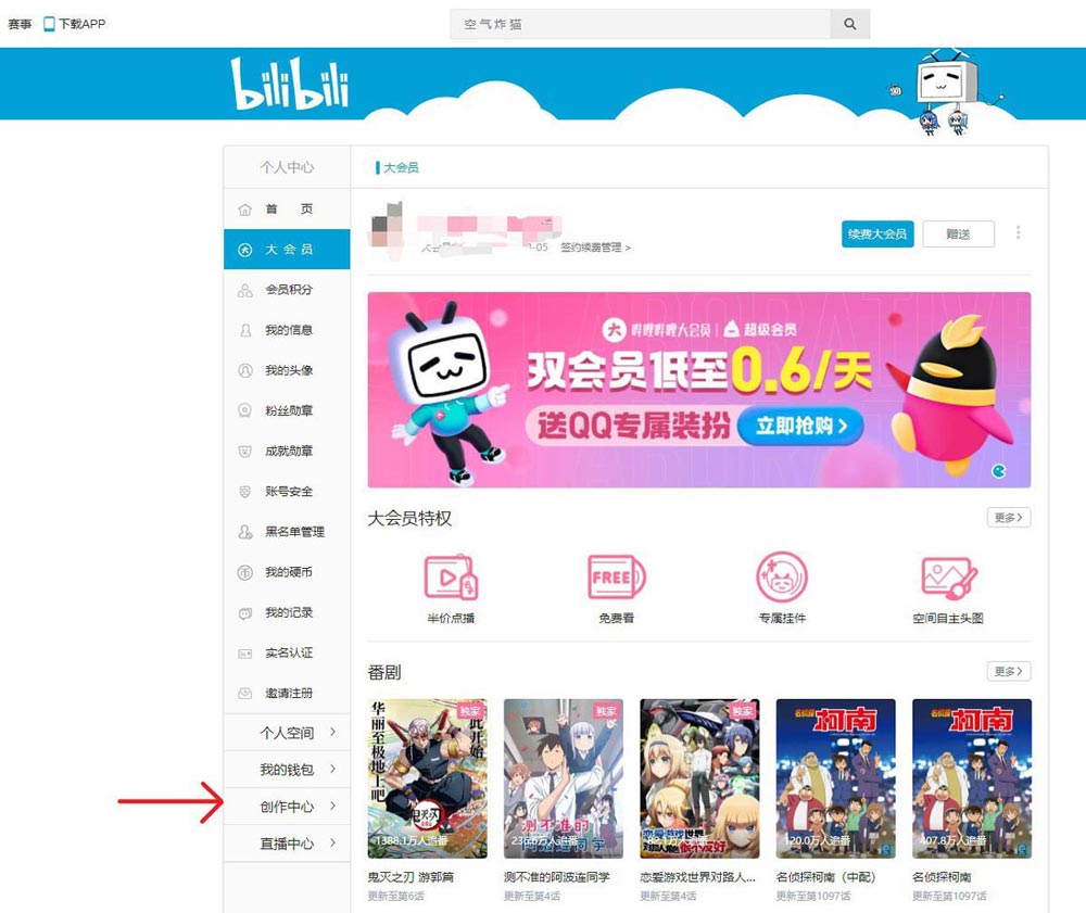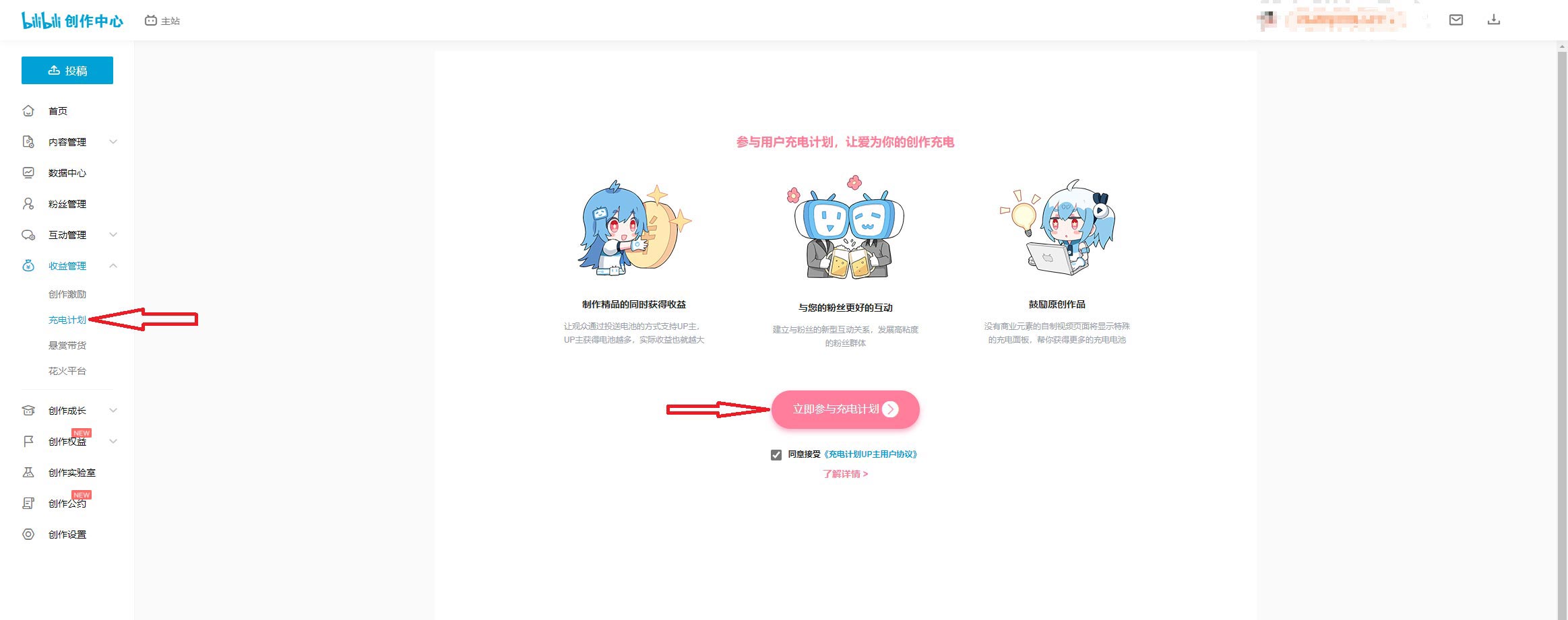 从菜单栏顶部的“大会员”菜单进入“大会员”页面,然后在页面的左侧菜单栏的下面部分找到“创作者中心”。进入到”创作者中心“页面后,在左侧菜单栏找到”收益管理“菜单,进入二级菜单”充电计划“去开启充电计划。