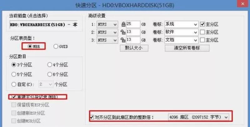 确保分区表类型为MbR ,及勾选了重建主引导记录MBR。