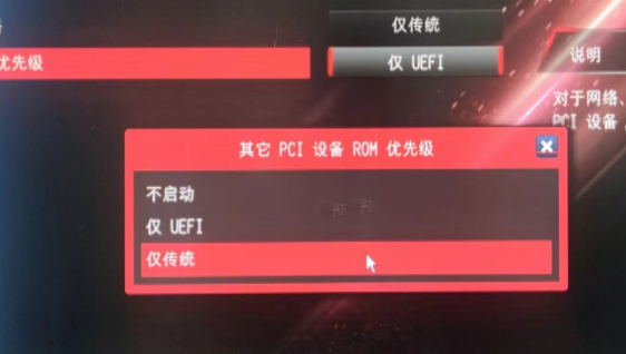 2、“其他PCIE/PCI设备ROM优先级”,选择“仅传统”。