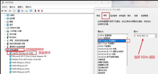 2、设备管理器窗口,找到并点击展开【网络适配器】,然后双击【 Intel 网卡 】。接着在打开的 Intel 网卡属性窗口,切换到【高级】选项卡,找到【802.11a/b/g 无线模式】,选择值为【5GHz】频段。