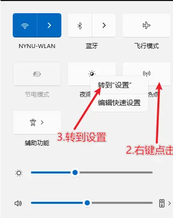 3、点击任务栏右下角的【WiFi】图标,打开快速设置,接着右键点击【移动热点】,再点击【转到“设置”】打开移动热点。