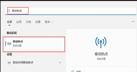4、或者直接按键盘上的【 Win + S 】组合键,或点击任务栏上的【搜索图标】,Windows 搜索窗口,搜索框输入【移动热点】,然后点击【打开】系统给出的最佳匹配【移动热点系统设置】。