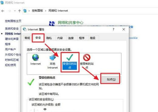 5、进入Internet选项卡,依次选择安全--受信任的站点,然后点击站点按钮,如下图所示。