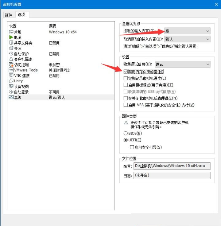 切到【高级】选项,同样将优先级设置为【高】并勾上【禁用内存页面修整】: