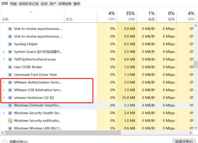 3、在windows中使用【Crtl+Shift+Esc】打开任务管理器,并找到以VM打头命名的进程,然后右键结束这些进程任务。