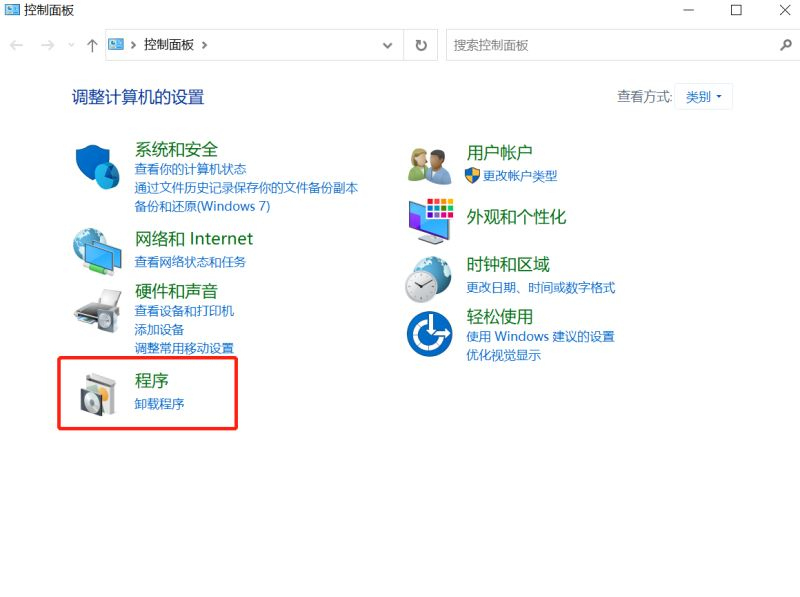 1、在windows中打开【控制面板】,然后点击【卸载程序】。