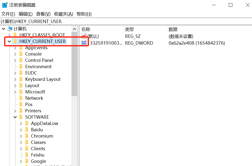 2、在【注册表编辑器】中找到【HKEY_CURRENT_USER】目录。