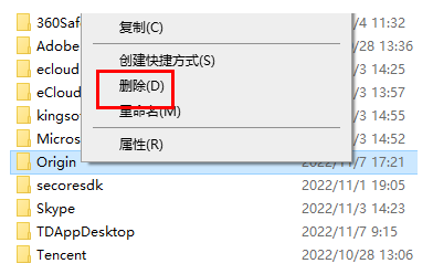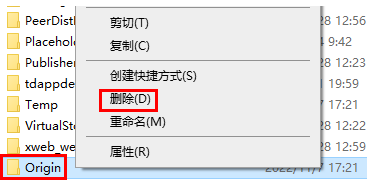 4、在返回appdata文件夹,进入local,这里也有origin文件夹,将其文件删除。
