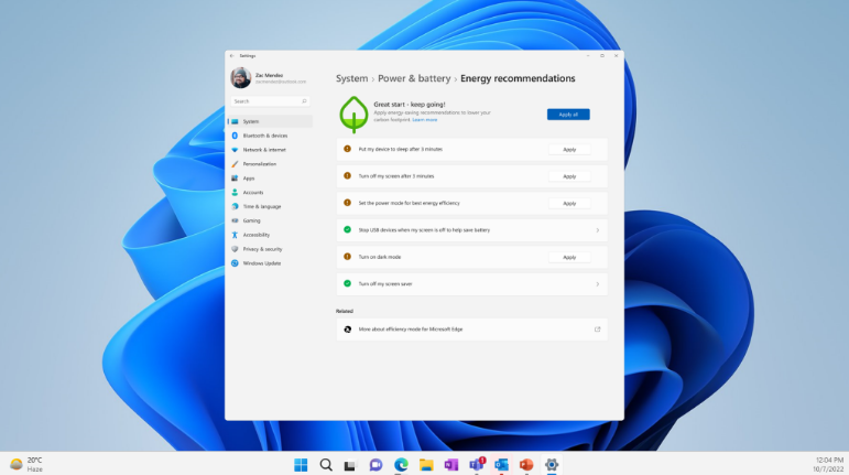 此外,在 build 22623.885 上,“电源和电池”设置页面现在包括“能源建议”,其中包含有关配置功能以节省能源和降低碳足迹的建议。