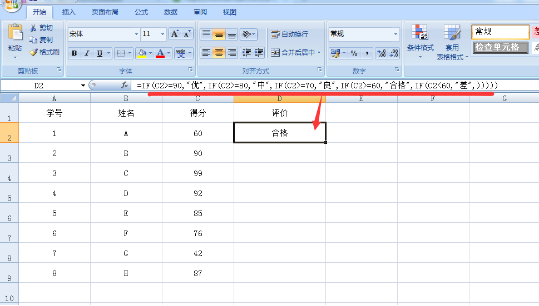 在E2单元格中输入=IF(C2>=60,“合格”,)(这里输入的时候将输入法切换为英文格式),然后就可以看到后面显示合格。这个单个条件的写法。