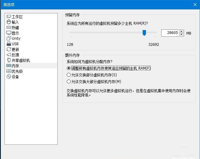 1、打开虚拟机的首选项,找到【内存】选项卡。