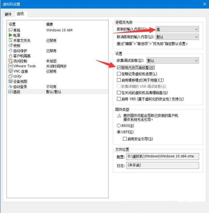 2、切到【高级】选项,同样将优先级设置为【高】并勾上【禁用内存页面修整】。