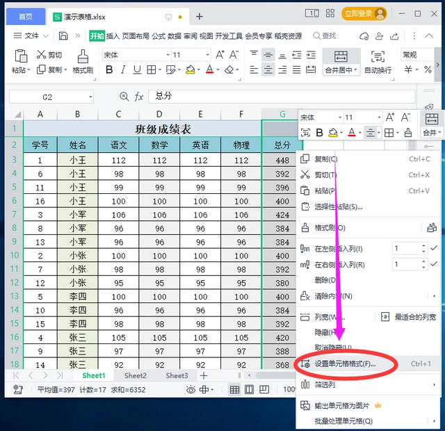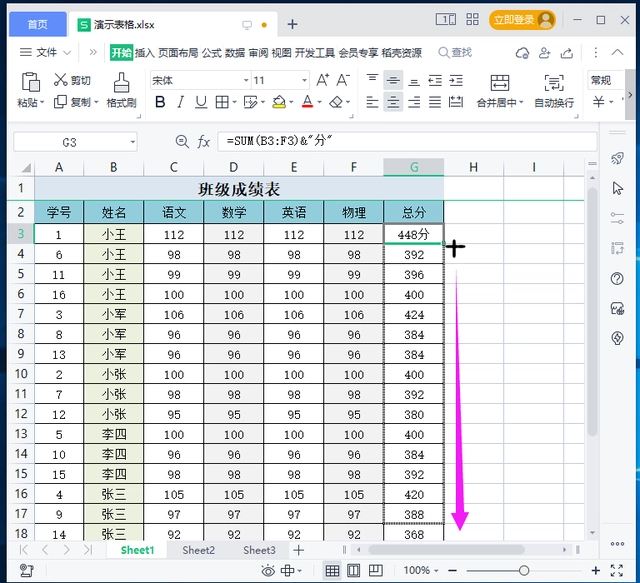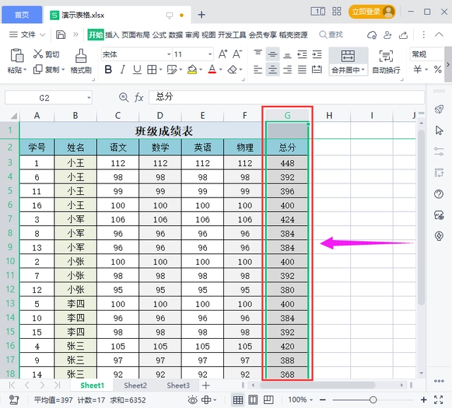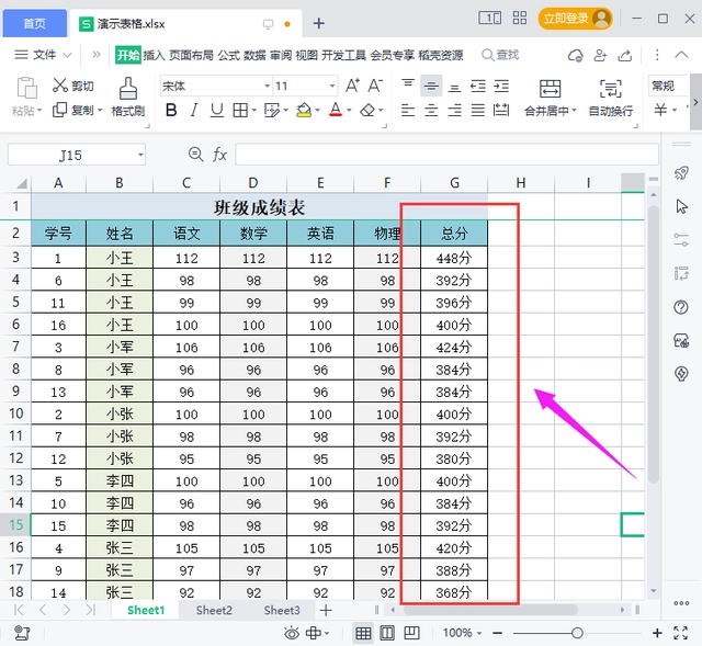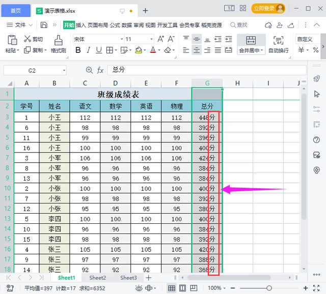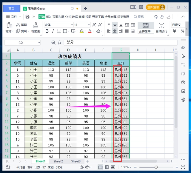 (1)首先打开一个要编辑的Excel工作表,例如对总分列批量添加前缀或后缀。