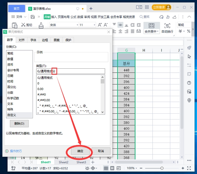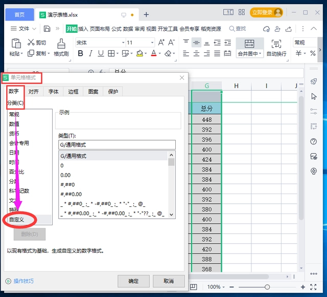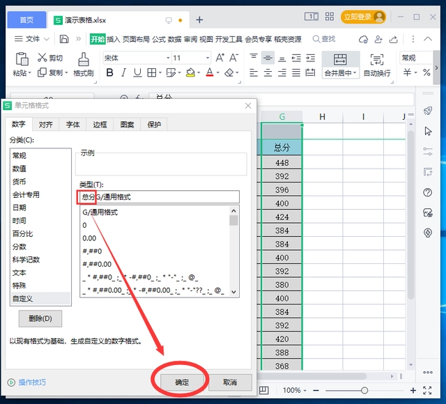 (5)单击自定义选项后,右边类型输入框里面的“G/通用格式”不要动,如果想要加前缀直接在它前面加上所要加的内容,如要加上前缀总分两字,那么就这样输入“总分G/通用格式”,如下图所示。