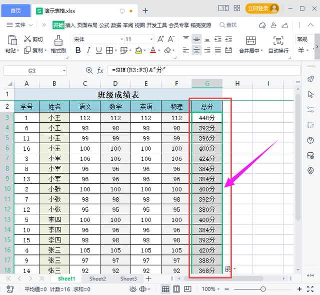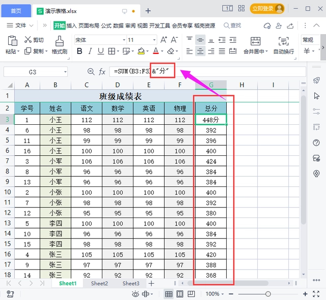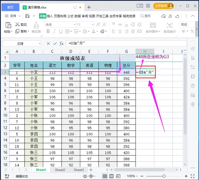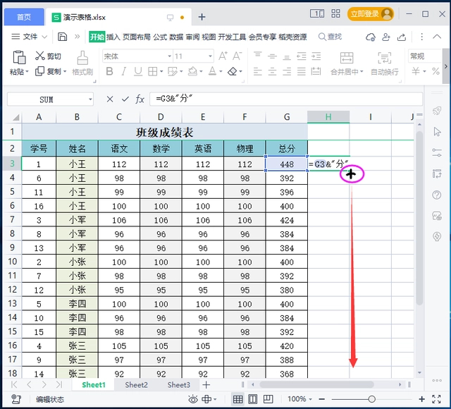 (1)打开一个要编辑的Excel工作表,例如对总分列批量添加后缀“分”字,选择新的单元格,为了方便操作选择相邻的那个单元格就行,然后在单元格里面写入公式“=“前缀”&原内容单元格编号”或者“= 原内容单元格编号& “后缀”。这里应该注意引号要在英文状态输入才管用,连接符“&”应同时按住“shift+7” 输入。如下图所示输入“=G3&“分””,其中G3为第一个总分448所在的位置坐标。