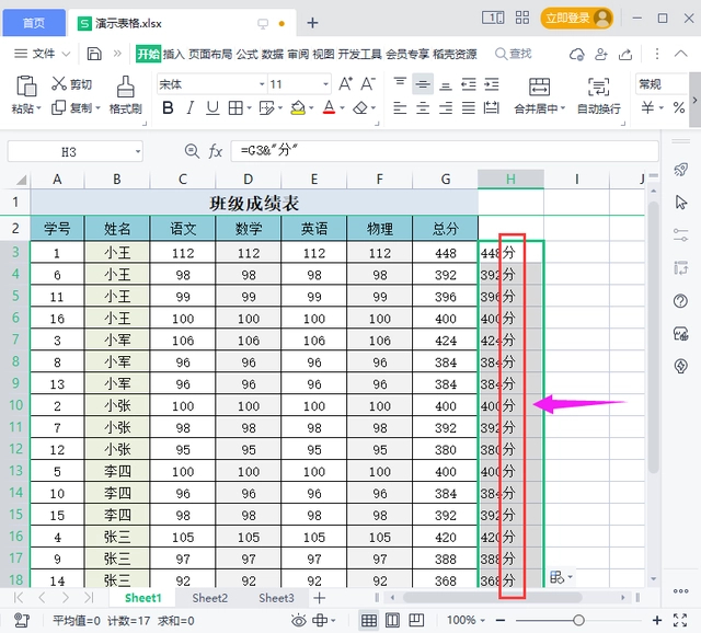 添加好要加的后缀内容后,点击下面“确定”按钮,我们再继续看一下效果,此时表格中的总分数字后面都已被批量加上了分字如下图所示。