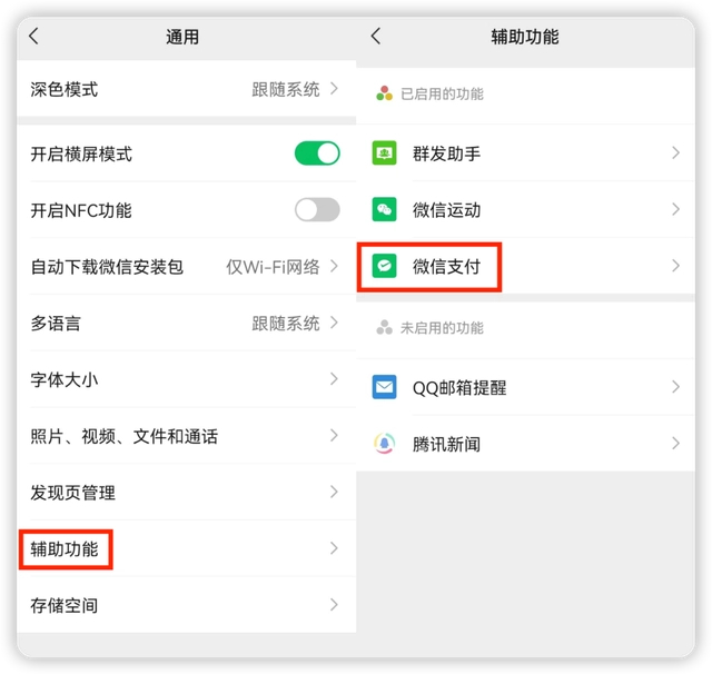 点击「我」-「设置」-「通用」-「辅助功能」-「微信支付」。