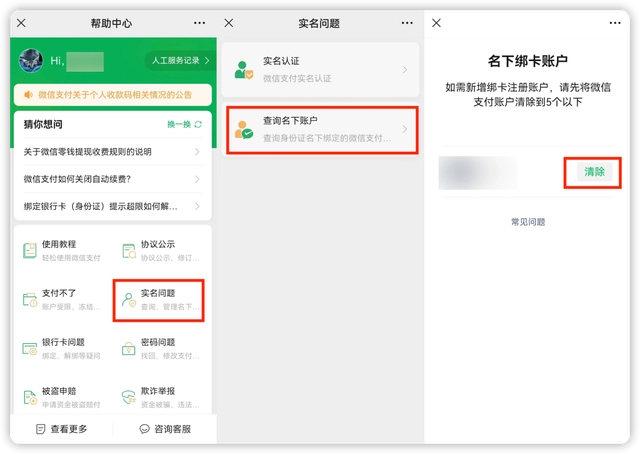 进入后点击「帮助中心」-「实名问题」-「查询名下账户」,进入后将陌生的名下支付账户清除即可。