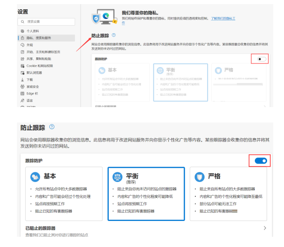 3、最后找到右侧中的“防止跟踪”功能,将“跟踪防护”右侧的开关按钮打开,然后将“跟踪防护”选为“平衡”就可以了。