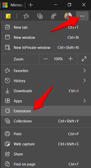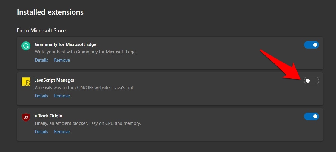 如果您使用处理脚本的第三方扩展程序,建议您立即禁用它们。虽然此域的扩展部分允许您添加和修改网页,但它们似乎是此问题的根本原因。因此,如果您现在考虑禁用它们,那将是最好的。以下是在 Microsoft Edge 中禁用 Javascript 扩展的步骤: