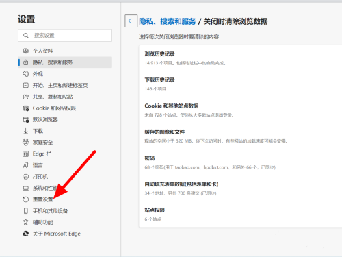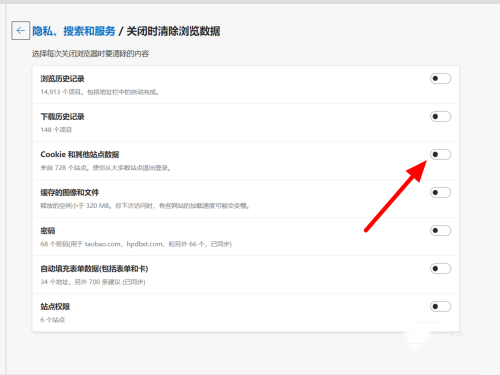 在隐私中点击选择每次关闭浏览器时要清除的内容。