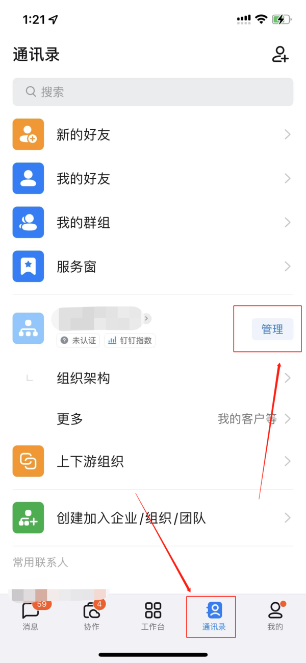 1、首先在手机中打开钉钉,在最下方的选项中点击“通讯录”,这这时在上方位置可以看到我们创建的组织名称,点击名称旁边的“管理”。