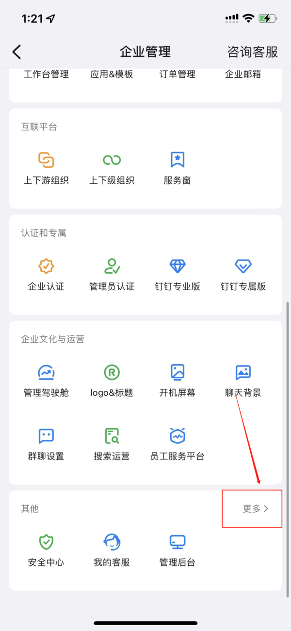 2、来到企业管理界面,拉到最下方在“其他”一项中单击“更多”。